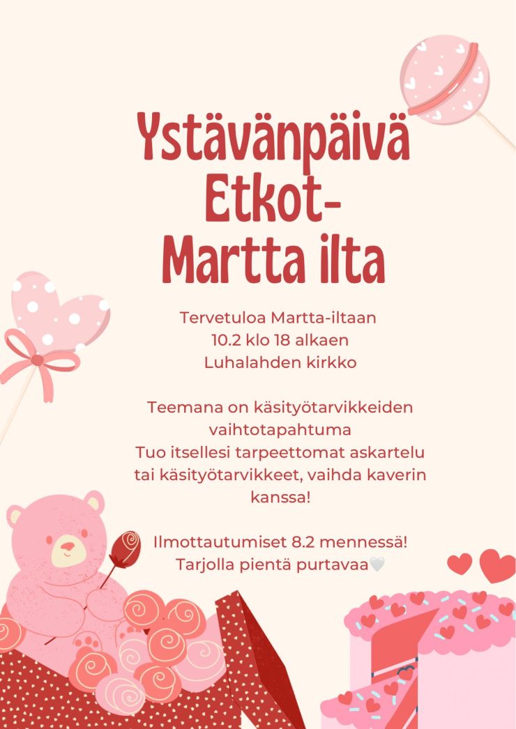Tervetuloa Martta-iltaan klo 18 alkaen Luhalahden kirkkoon.